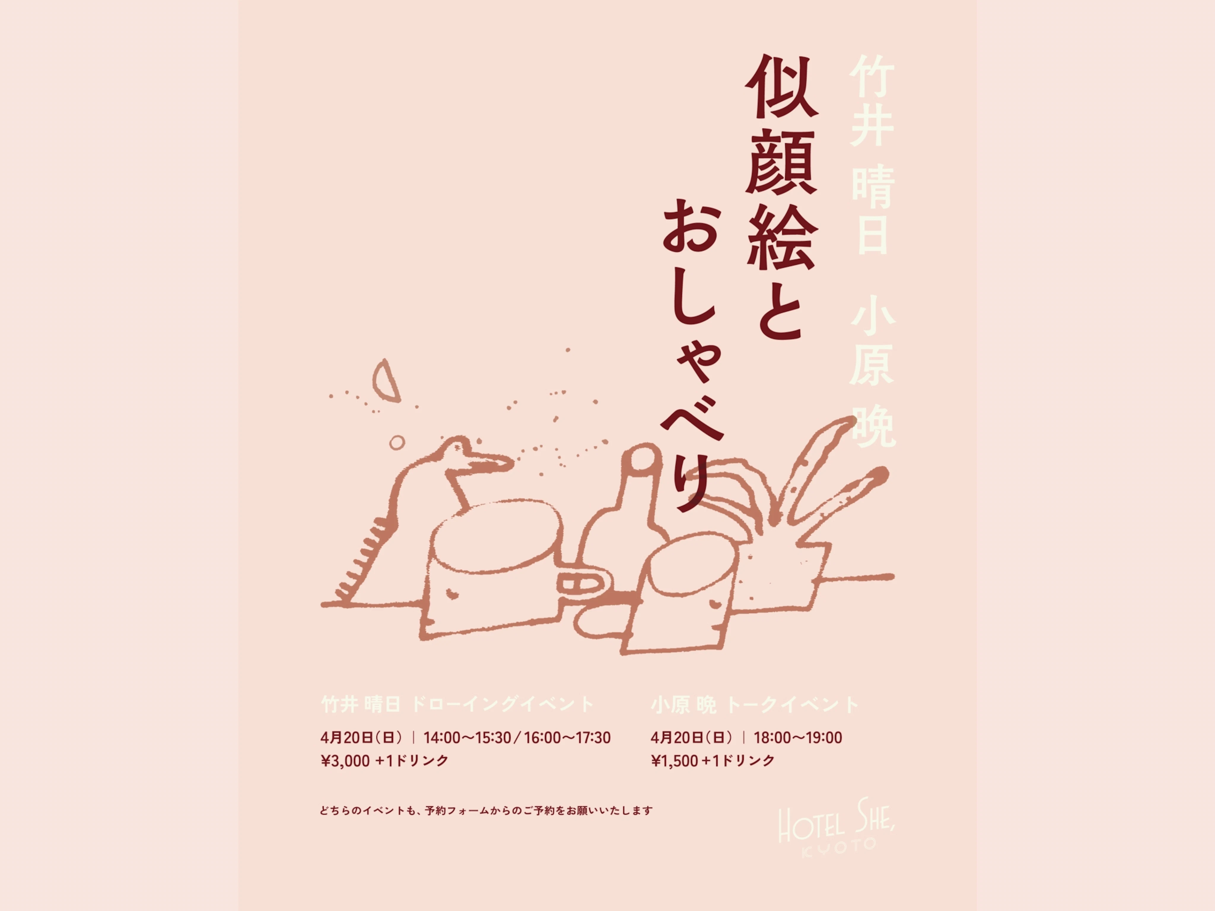 4月20日(日)にはHOTEL SHE, KYOTOロビーにて竹井晴日さんによる似顔絵と、小原晩さんによるトークイベントも開催します。