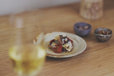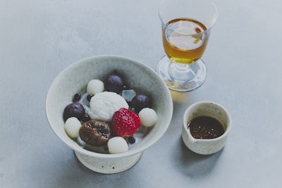 1階のcafe & bar 「菓寮 浮雲」では、菓子や肴とともに「曲水の宴」の趣をお楽しみいただけます。朝餉には、京都を拠点に活動する「円卓」の庄本彩美氏監修のもと、丹後の郷土食である「ばら寿司」からインスパイアされた御膳をご用意。カフェの時間には、葉山を拠点に活動する「嶋ゞ」の小島直子氏が監修した、天橋立の自然を描写した和菓子と茶のペアリングをお楽しみいただけます。京都の老舗和菓子店「有職菓子御調進所 老松」がつくる上生菓子とともに、宮津の日本茶専門店「磯野開化堂」の日本茶をご用意いたします。また、夜の時間はバーとして、お酒や和菓子、肴などをご用意しています。