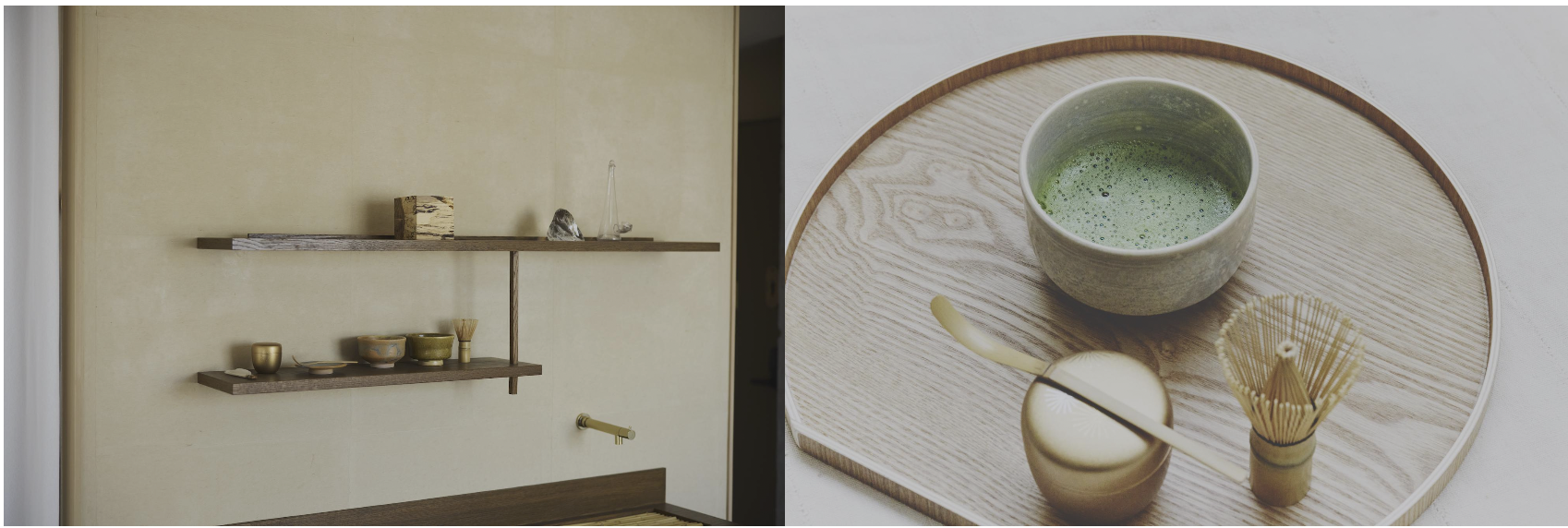 客室には、宿の名の由来にもなった“水屋”をしつらえ、大きいお部屋には湯を静かに湛える茶釜を、小さいお部屋には手のひらに寄り添う鉄瓶をご用意いたしました。陶芸家の片川祐之介氏の茶器で、京都の茶園で摘まれた香り高いお茶をお楽しみいただけます。また、水屋の壁には黒谷和紙職人・アーティストのハタノワタル氏率いる紙漉キハタノの手漉き和紙をあしらいました。