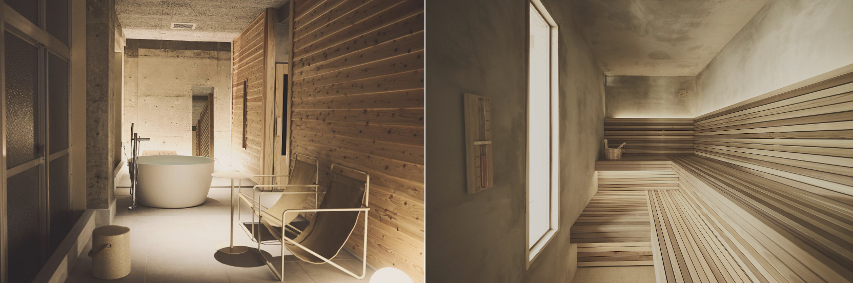 テキスタイルデザイナー・PARANOMADの原田美帆氏が手がける客室内のファブリックには、丹後の地で織り継がれてきた「ちりめん」を使用。各客室のルームナンバーには藤織作家である坂根博子氏による布片に、藤蔓の糸で刺繍を施しました。また、客室をはじめ、cafe & bar「菓寮 浮雲」やサウナなど、館内にはcredenzaの堀正樹氏がキュレーションしたインテリアやアートピースが並びます。